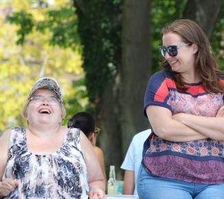Two women sit in nature, looking to the left of frame where one of them is pointing.