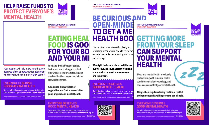 We have a selection of posters you can use to help with your fundraising.Mental health tips postersA series of ten posters, each highlighting one way of looking after your mental health.Download PDFBlank fundraising posterA template poster you can use to promote your fundraising event. Download PDF